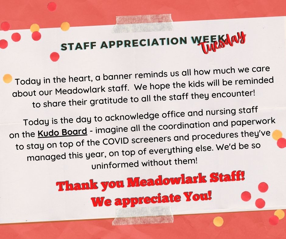 Today in the heart, a banner reminds us all how much we care about our Meadowlark staff. We hope the kids will be reminded to share their gratitude to all the staff they encounter!
