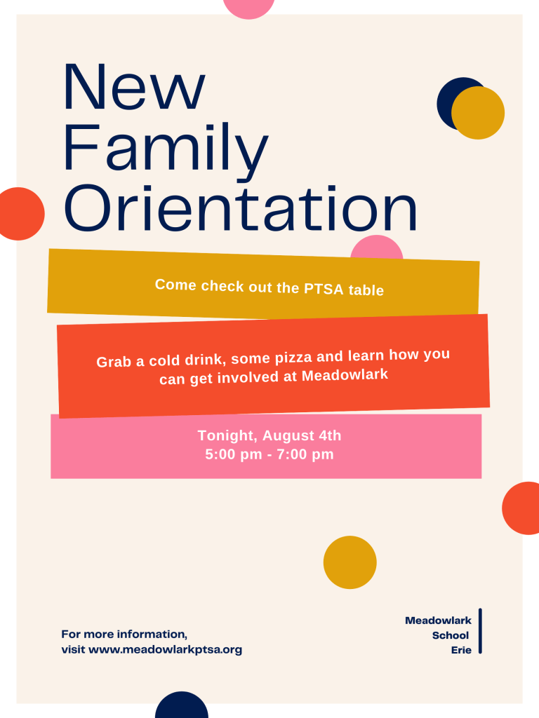 We will be there with pizza, cold drinks and warm welcomes to all our new Meadowlark Families between 5-7pm.