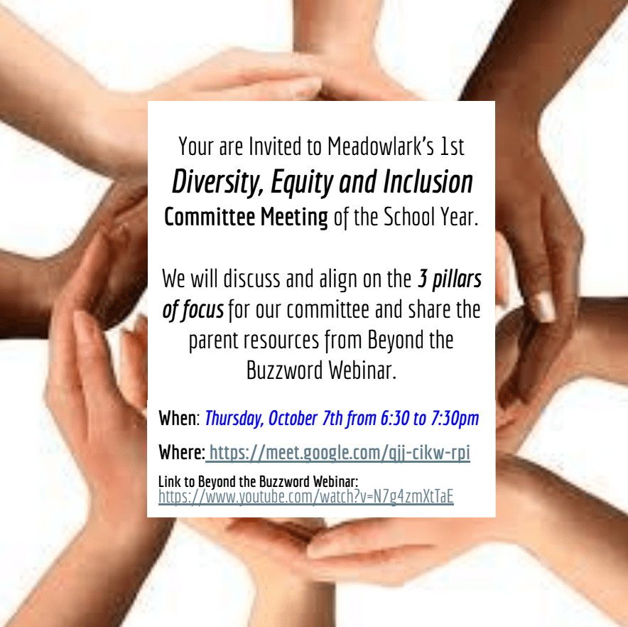 Details: Your are Invited to Meadowlark’s 1st Diversity, Equity and Inclusion Committee Meeting of the School Year.We will discuss and align on the 3 pillars of focus for our committee. Plus we will share the parents resource guide from the Beyond Buzz Word webinar.
