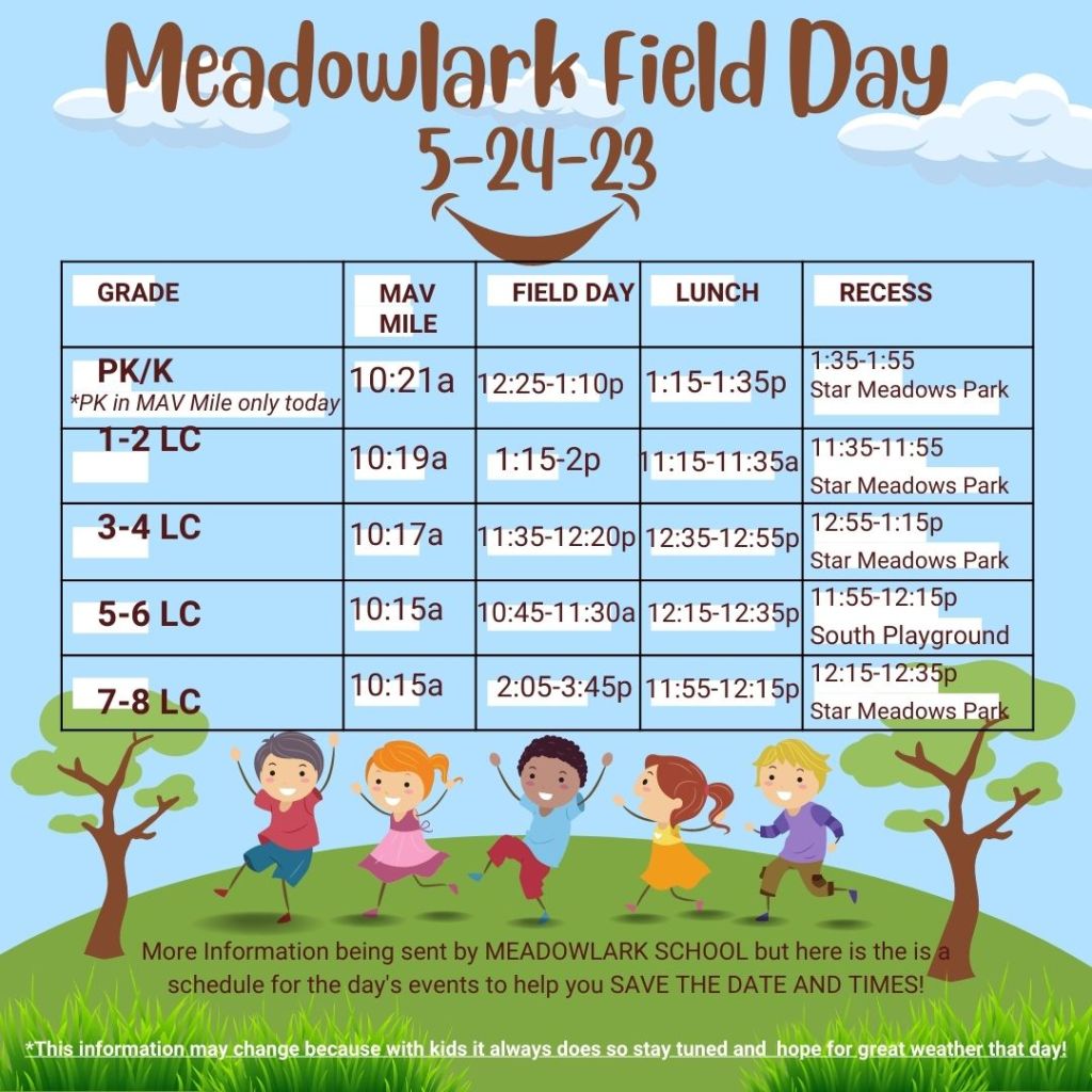 The Mav Mile Fun Run is back on May 24, 2023! The event will start around 10:00am at Meadowlark School and will follow paths around the school from 10:15M-11:00AM.