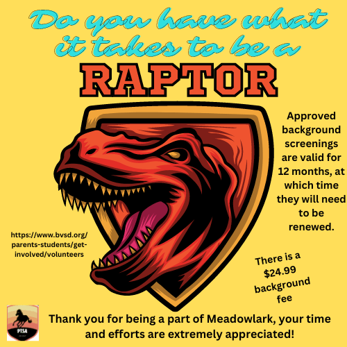 REMINDER: If you are planning to volunteer this school year, attend field trips, etc., you’ll want to make sure you have completed a recent Raptor background check! (Which are only good for 12 months/365 days from your last approval).