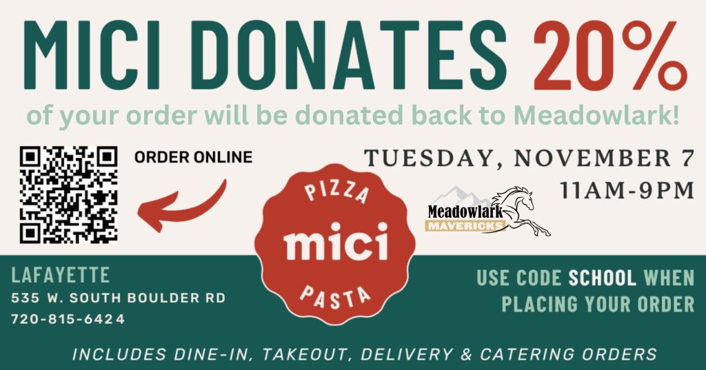 They’re open from 11am – 9pm and 20% of your order will go back to Meadowlark! Good for online or in person! You must use code SCHOOL when ordering online, or mention “Meadowlark Fundraiser” when ordering in store.