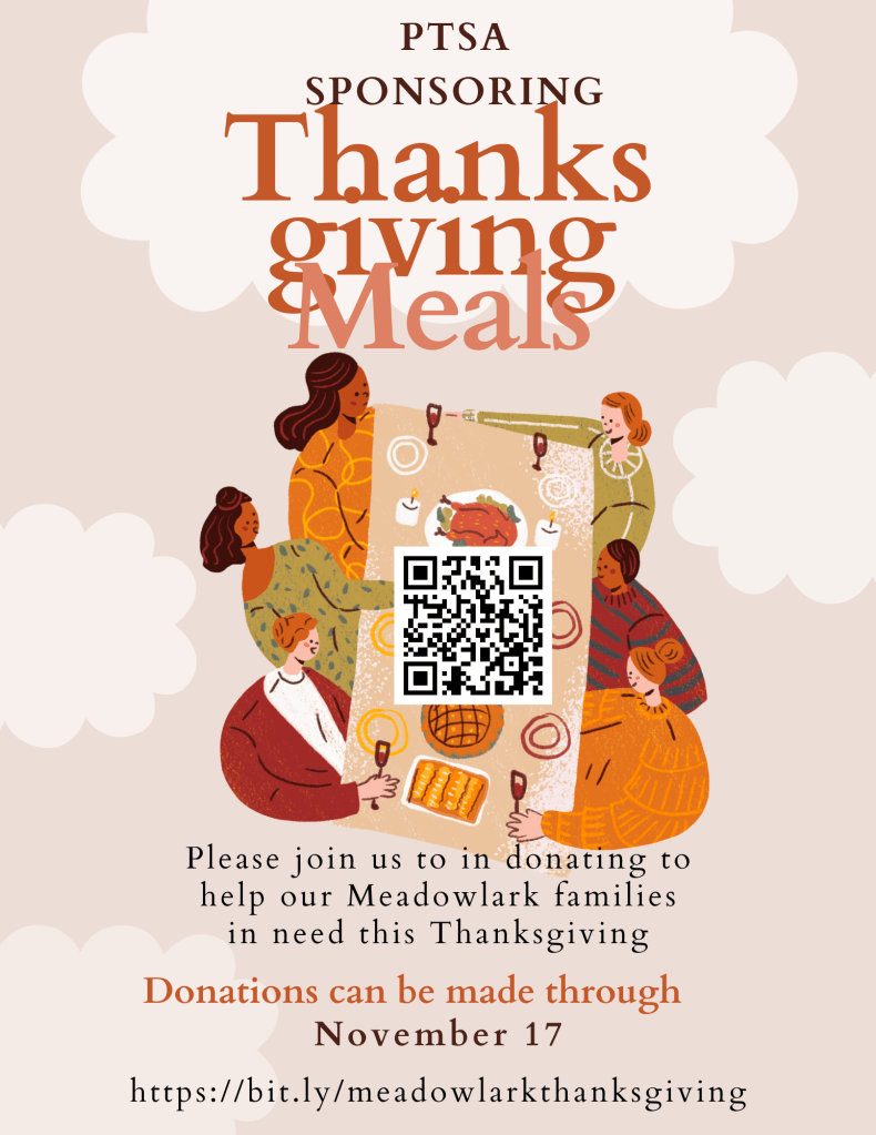 The PTSA is proud to sponsor our annual Thanksgiving Meal Campaign and we are asking for donations to help 35+ Meadowlark families in need. All gift amounts help!
