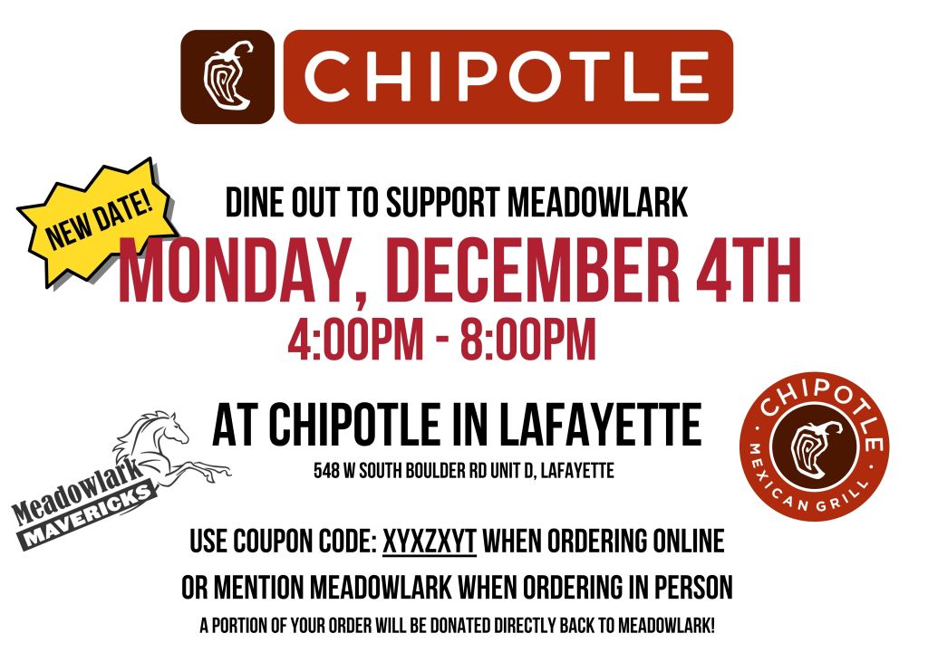 CHANGE OF DATE! Join us at Chipotle in Lafayette on Monday, December 4th from 4pm-8pm!