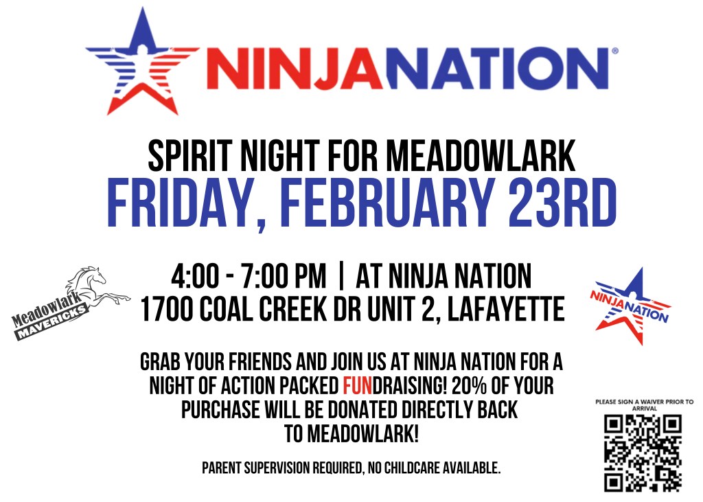 Mention the Meadowlark fundraiser when you arrive! Please fill out the Ninja Nation waiver before you arrive, available at www.lafayette.ninjanation.com or by scanning the QR code below.