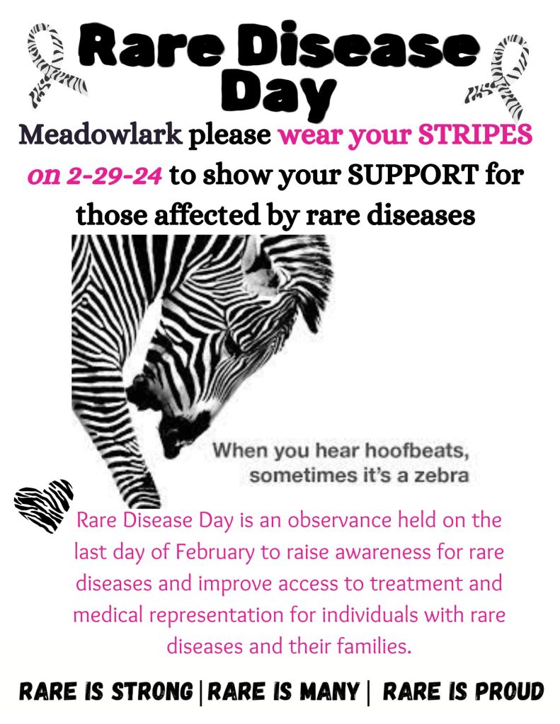 To help our community celebrate Rare Disease Day, we are inviting Meadowlark families, students and staff to wear stripes on Thursday, February 29th, in celebration of Rare Disease Day.