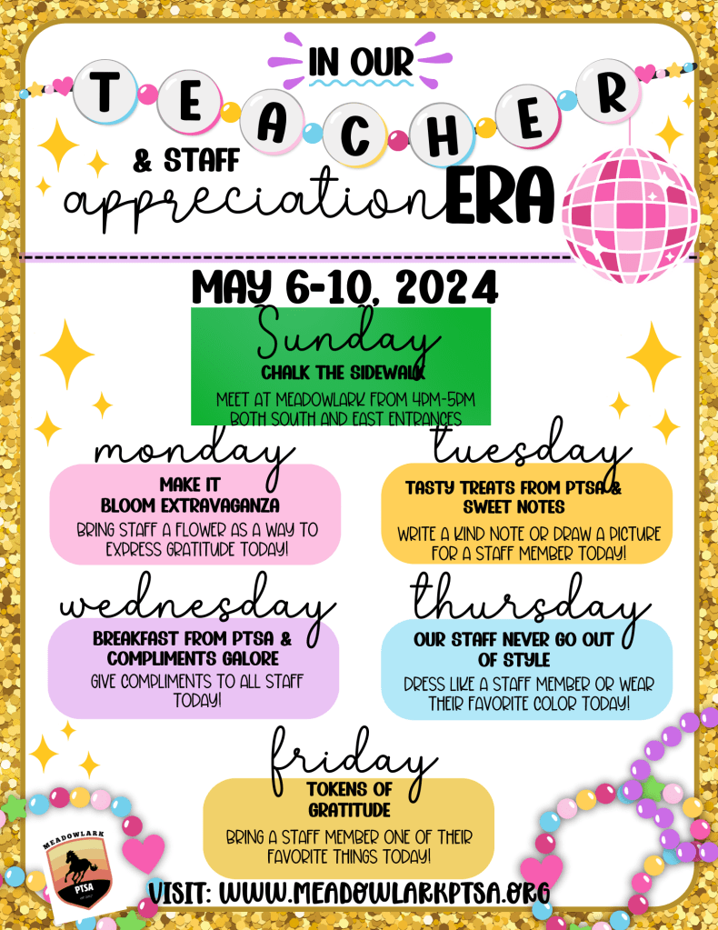 We would like to invite our PARENTS and STUDENTS to partner with our PTSA and join us in our Teacher and Staff Appreciation Era week from May 6-10th! Here are the event activities and ways to make this Teacher and Staff Appreciation Era Week UNFORGETTABLE!