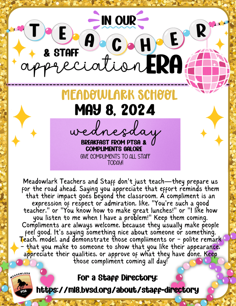 Meadowlark Teachers and Staff don’t just teach—they prepare us for the road ahead. Saying you appreciate that effort reminds them that their impact goes beyond the classroom. A compliment is an expression of respect or admiration, like, “You’re such a good teacher,” or “You know how to make great lunches!” or “I like how you listen to me when I have a problem!” Keep them coming. Compliments are always welcome, because they usually make people feel good. It’s saying something nice about someone or something. Teach, model, and demonstrate those compliments or – polite remarks – that you make to someone to show that you like their appearance, appreciate their qualities, or approve of what they have done. Keep those compliments coming all day!