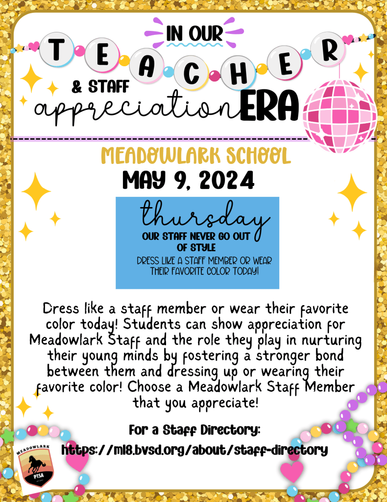Dress like a staff member or wear their favorite color today! Students can show appreciation for Meadowlark Staff and the role they play in nurturing their young minds by fostering a stronger bond between them and dressing up or wearing their favorite color! Choose a Meadowlark Staff Member that you appreciate!