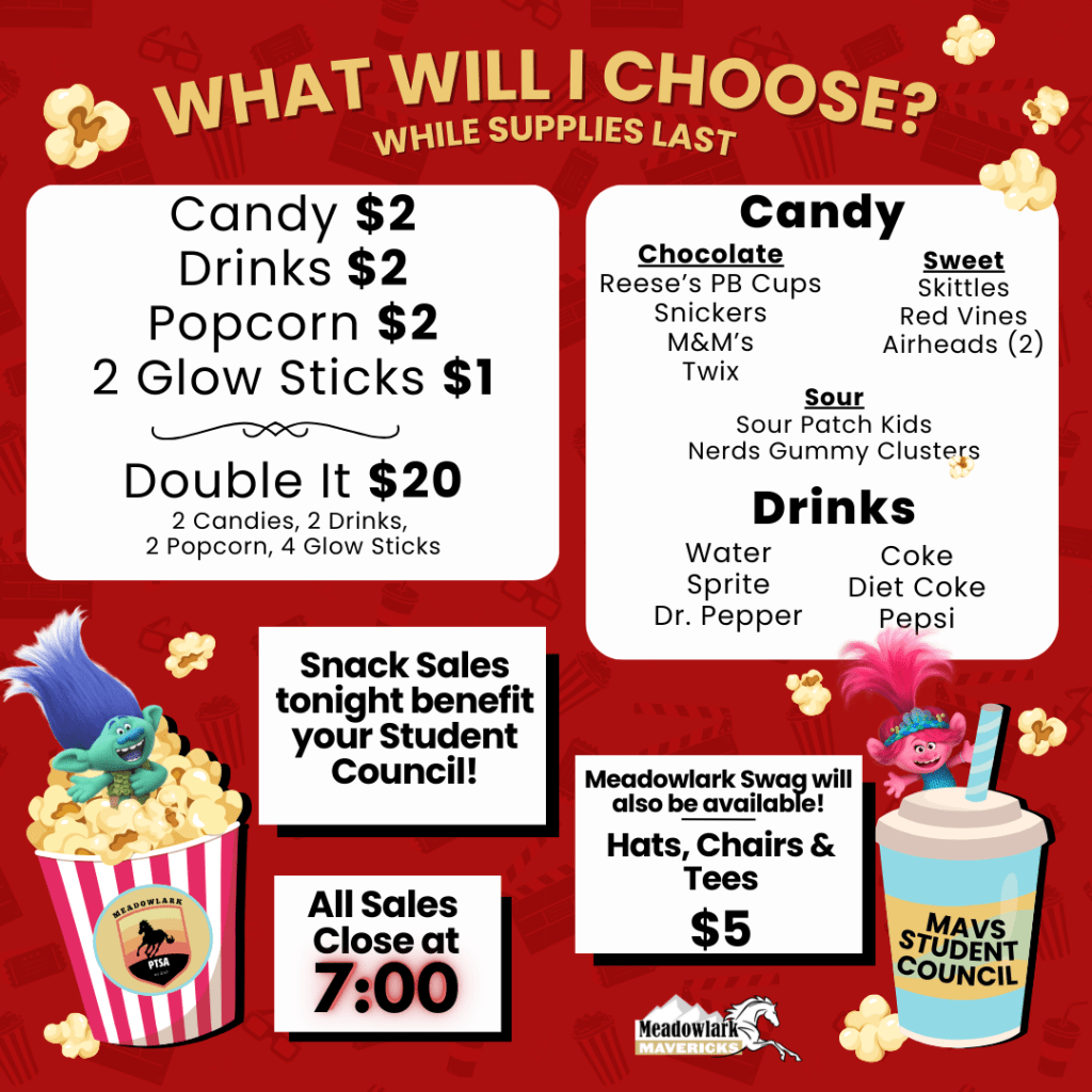 🍿All concession sales are being donated to the 5/6 & 7/6 LCs and the Student Council’s school-wide initiatives – which benefit ALL students! 🍫🍬
